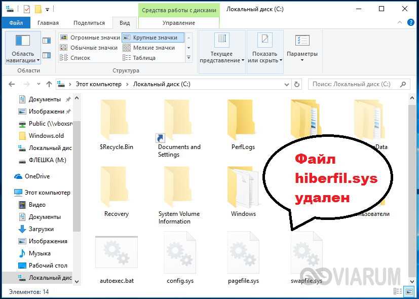 Перезагрузите компьютер и убедитесь, что скрытый системный файл hiberfil.sys удалён с диска C.