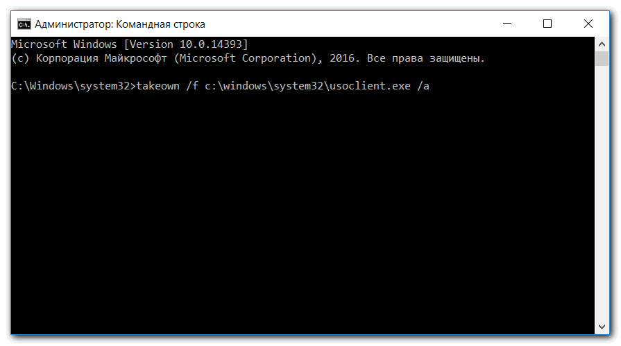Ввести команду «takeown /f c:\windows\system32\usoclient.exe /a» и нажать Enter.