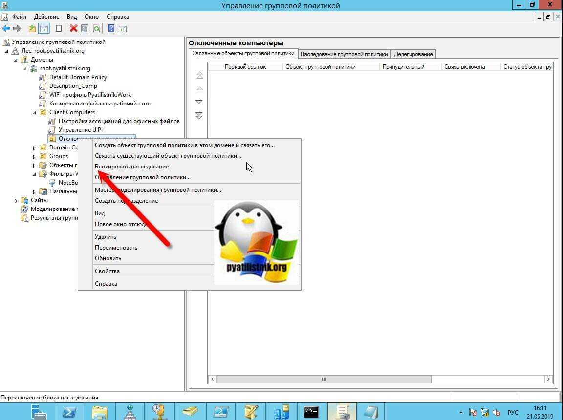 Выше я вам писал, что структура OU иерархическая, а это означает, что политика прилинкованная с вышестоящего организационного подразделения применяется на нижестоящее. Но вот если у нижестоящей OU отключено наследование сверху, то он не сможет применить данную политику. Проверяется очень просто, найдите нужную вам OU, щелкните по ней правым кликом и удостоверьтесь, что не стоит пункт «Блокировать наследование».