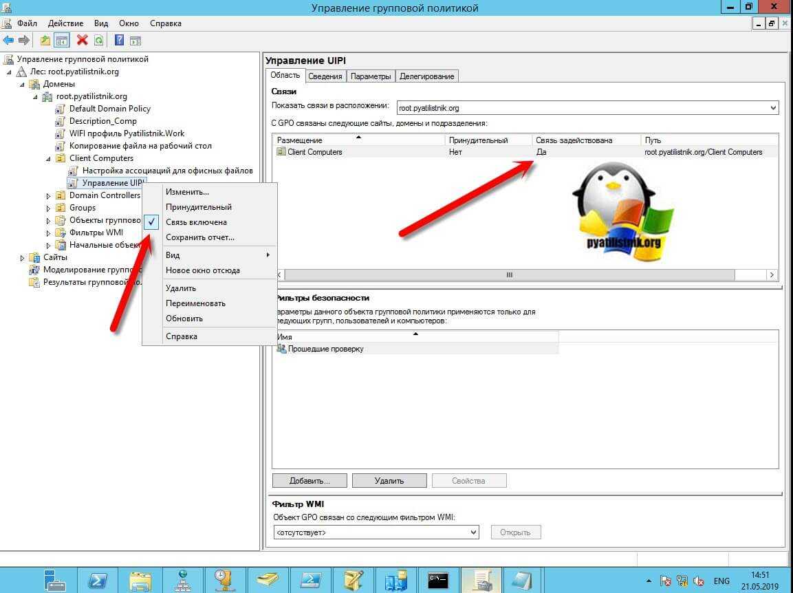 Далее убедитесь, что у вас элементарно включена связь объекта групповой политики с нужным организационным подразделением. Для этого в оснастке управления GPO, щелкните правым кликом по нужной политике и в контекстном меню проверьте, что установлена галка «Связь включена», ее так же можно проверить на вкладке «Область» в столбце «Связь задействована», должно стоять значение «да».