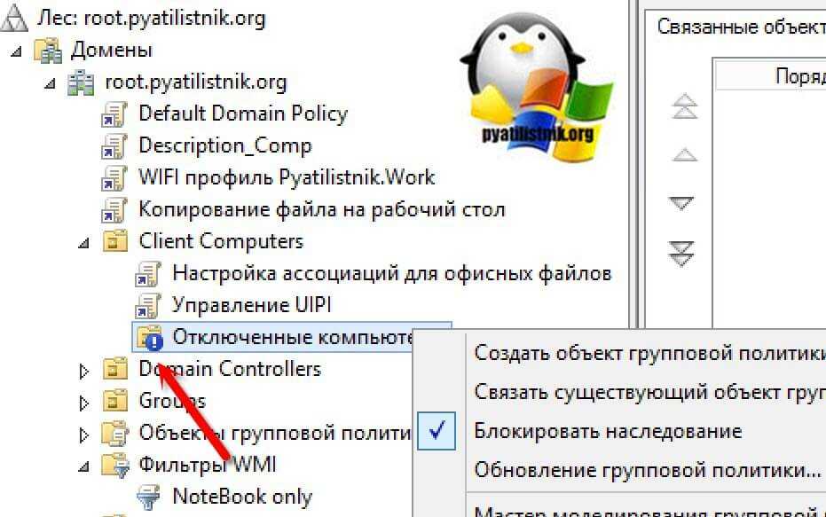 Блокирование наследования. По умолчанию дочерние объекты наследуют все объекты групповой политики от родительского, но вы можете заблокировать это наследование.