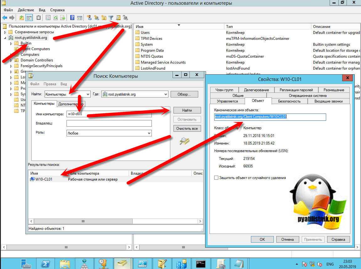 Так как Active Directory, это иерархическая структура, то одна OU можете быть часть дерева из других и сама включать в себя большое количество организационных подразделений. Поэтому если у вас есть вложенность, то просто зайдя в нужную OU вы можете сразу не найти нужный объект. В таком случае воспользуйтесь поиском по Active Directory. Например у меня есть рабочая станция с которой идут жалобы на применение объекта GPO. В поиске выбираем в поле «Найти» компьютеры и в имени указываем w10-cl01, после чего нажимаем «Найти». В результатах поиска вы получите выдачу. Щелкаем по нужному объекту и переходим в нем на вкладку «Объект», где смотрим «Каноническое имя объекта», по сути это его путь расположения в Active Directory. Сравниваем его с тем, что получили из области применения групповой политики и делаем вывод, попадает объект под действие или нет.