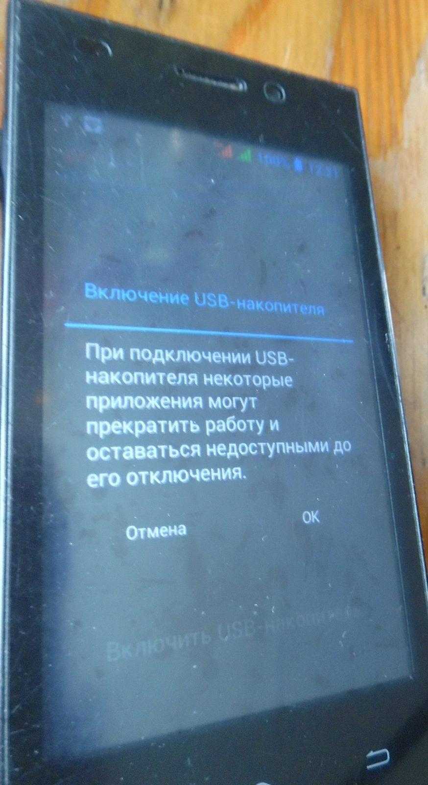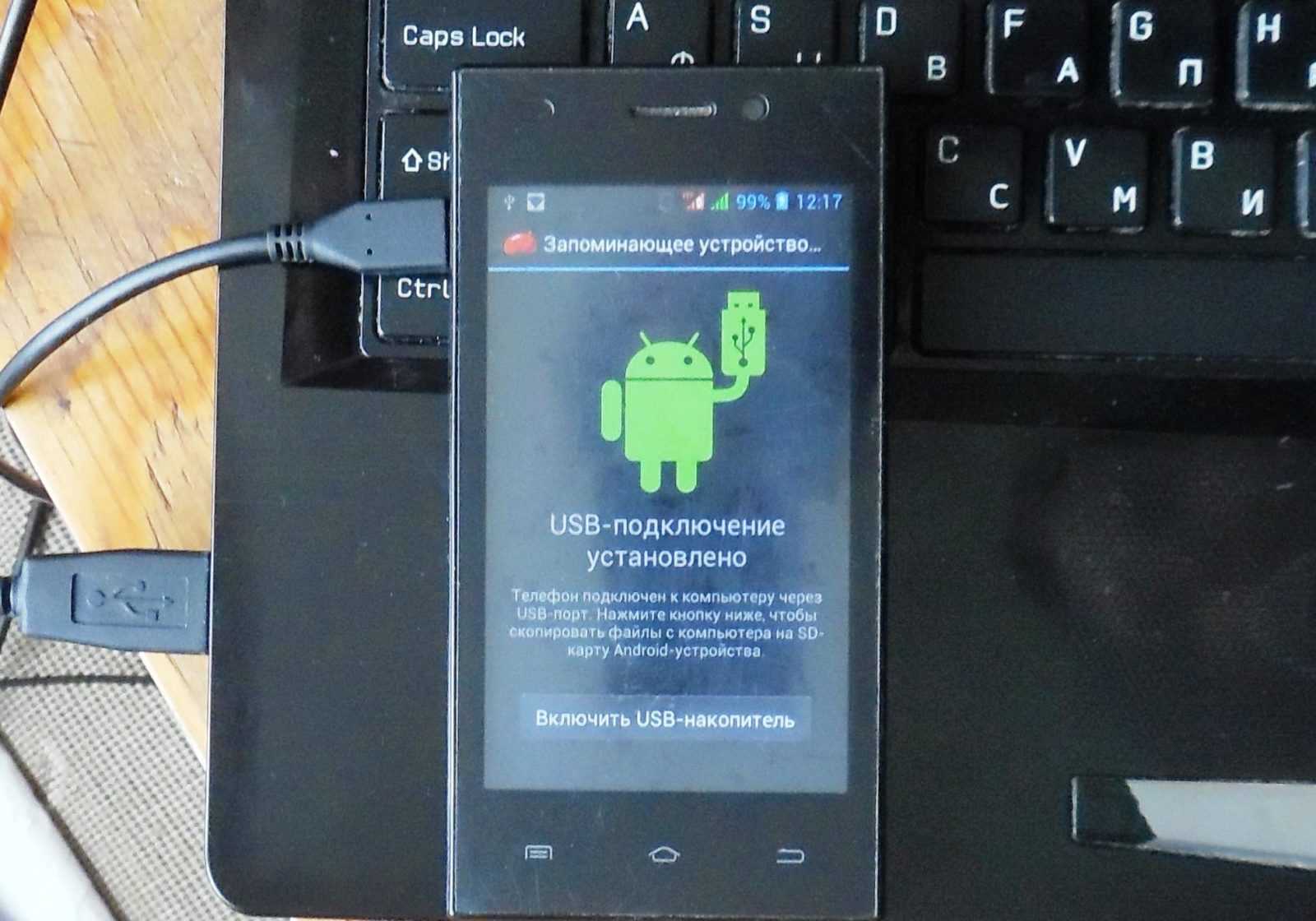 Когда провод будет подсоединен к обоим устройствам, на телефоне появится надпись: «USB подключение установлено»,«Включить USB накопитель».