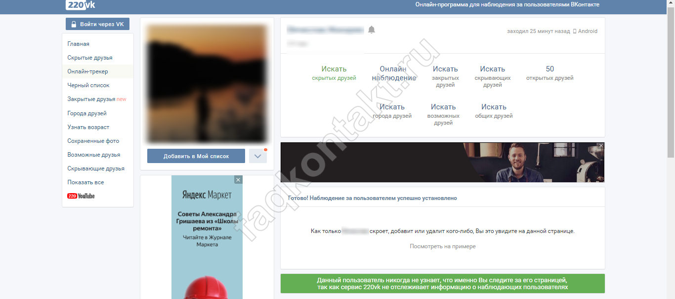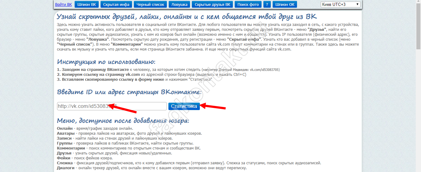 Ещё один популярный сервис, работающий аналогично 220ВК. Он позволяет посмотреть, кого скрывает выбранный пользователь. Для получения информации о спрятанных друзьях выполняем такие действия: