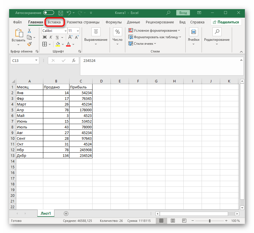 Когда все ячейки будут выделены, перейдите на вкладку «Вставка».
