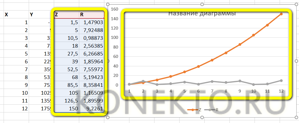 Составить в Excel таблицу с заголовками, отображающими суть каждой зависимости. Пусть для примера это будут просто X, Y, Z и R. В этой таблице сразу можно задать значения оси абсцисс (X) и параметра R, не выражаемого известной функцией.