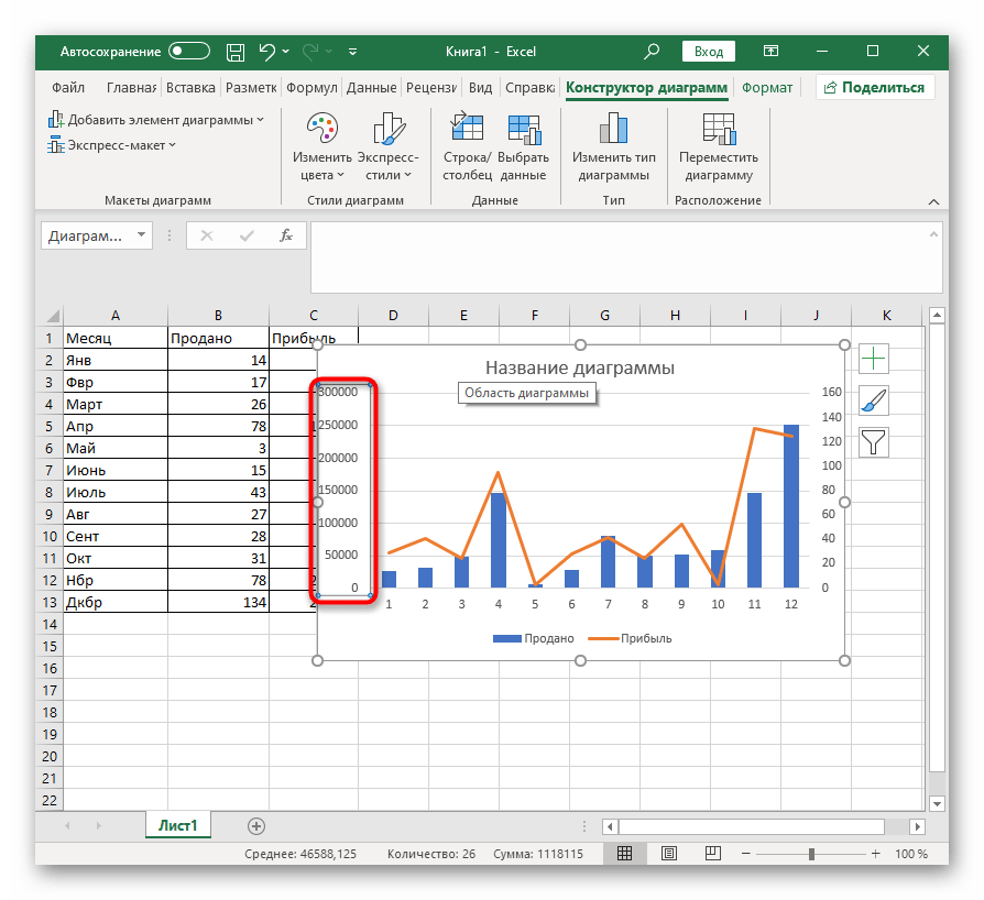 Разберемся с теми значениями, для которых и нужно создать график, отличающийся от первого. Изначально может сложиться такая ситуация, что из-за большой разницы в диапазоне значений его ось не будет видна в диаграмме, поэтому нужно ее настроить.