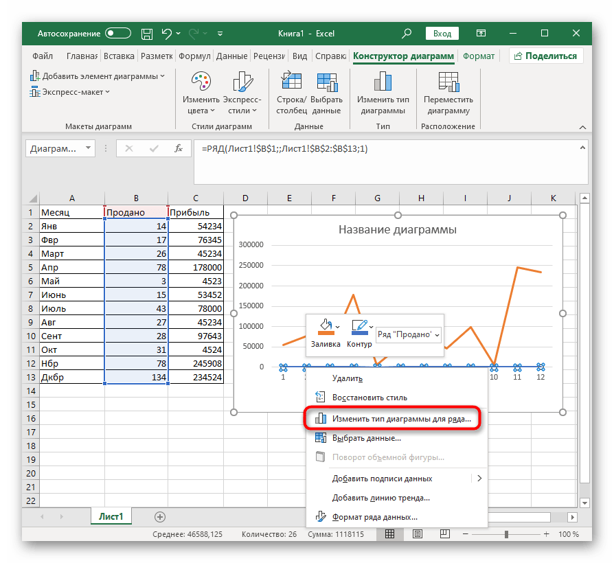 - Кликните по ряду правой кнопкой мыши и в контекстном меню выберите пункт «Изменить тип диаграммы для ряда».