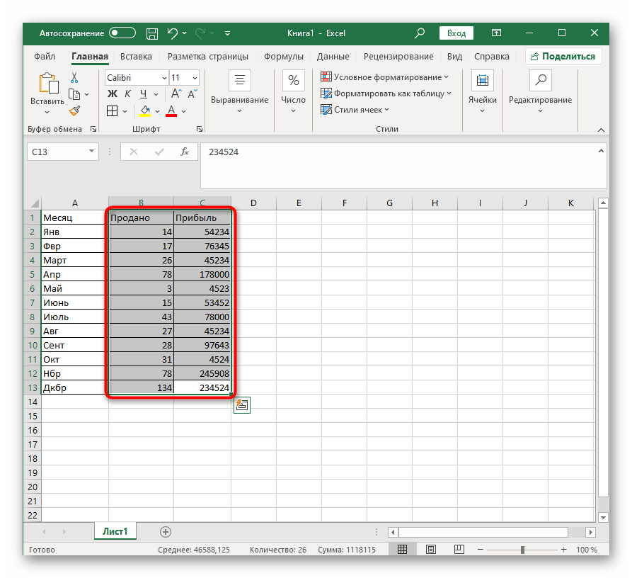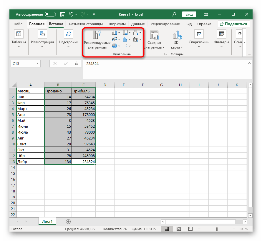 - Вставка диаграммы производится уже после того, как все значения выделены, а значит, это нужно сделать прямо сейчас, зажав левую кнопку мыши и проведя курсором по всем блокам. Захватите и названия столбцов, чтобы они соответствовали названиям осей.
