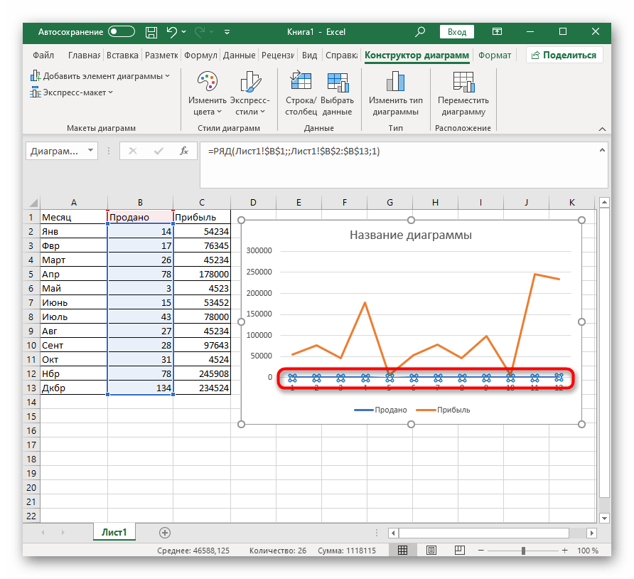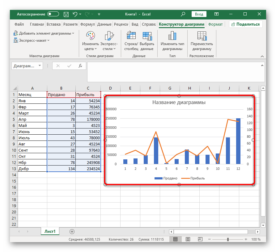 - На вкладке Конструктор (Design) можно добавлять, удалять или настраивать элементы, такие как название диаграммы и легенда.