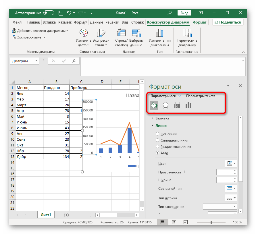 В появившемся окне ознакомьтесь с настройками вкладки «Параметры оси». Помимо визуальных изменений внизу есть и выбор разбежности в значениях, предоставляется возможность поработать с линиями или присутствующими столбцами.