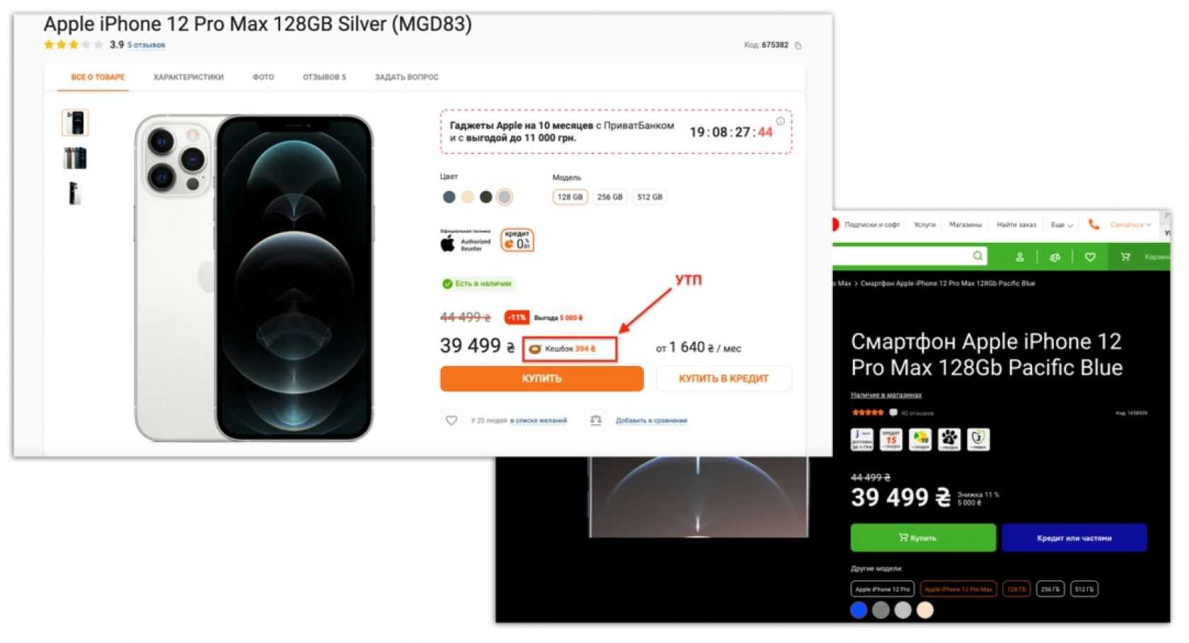 Например, в онлайн-магазинах «Цитрус» и Comfy телефон iPhone 12 Pro Max стоит одинаково — 39 499 грн. Но «Цитрус» с этой покупки начисляет 394 гривны кэшбека для следующих покупок. Это и есть УТП, которое при прочих равных делает одно предложение выгоднее другого.