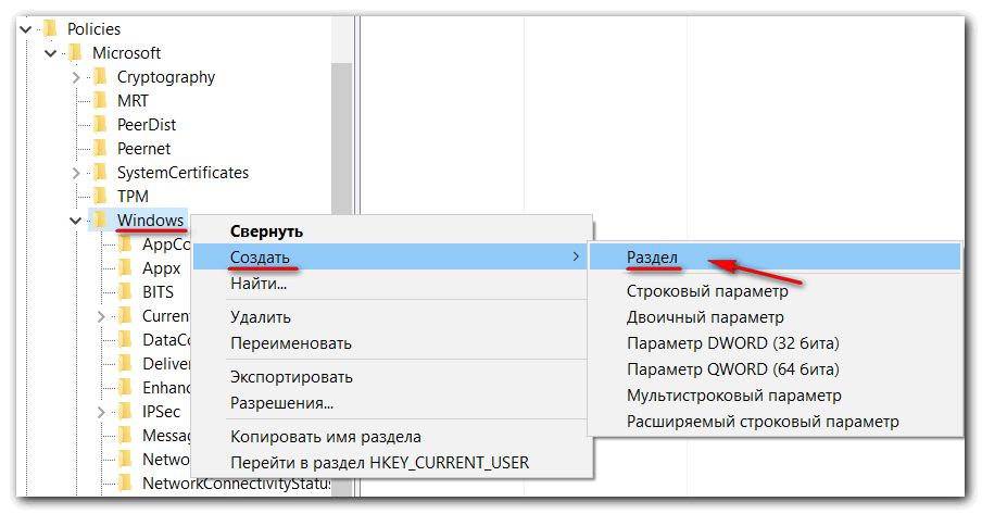 - Заходим в раздел HKEY_LOCAL_MACHINE. Здесь нас будет интересовать пункт SOFTWARE. Открываем его и дальше следует по следующему маршруту: Policies-> Microsoft-> Windows. Здесь нам необходимо создать раздел WindowsUpdate: