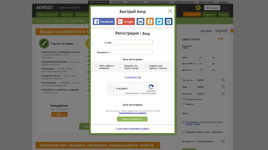 Первым делом, конечно, следует зарегистрироваться. В правом верхнем углу сайта нажмите кнопку «Регистрация». Перед вами появится соответствующее окно. Вам достаточно заполнить электронную почту и внести псевдоним, под которым вы будете работать на Адвего. Также регистрацию можно выполнить с помощью предложенных социальных сетей.