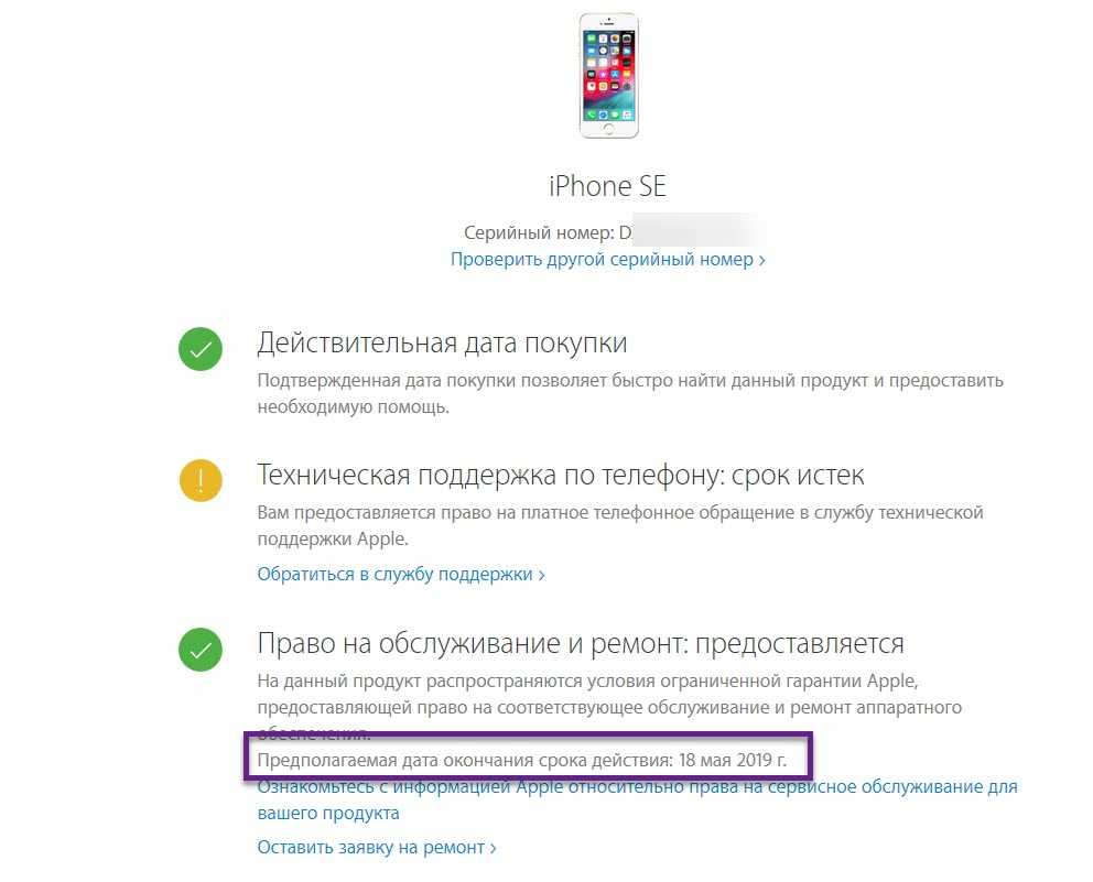 В следующее мгновение на экране отобразится проверяемое устройство. Если оно неактивно — об этом будет сообщено. В нашем же случае речь идет об уже зарегистрированном гаджете, для которого дополнительно указывается предполагаемая дата окончания гарантии.