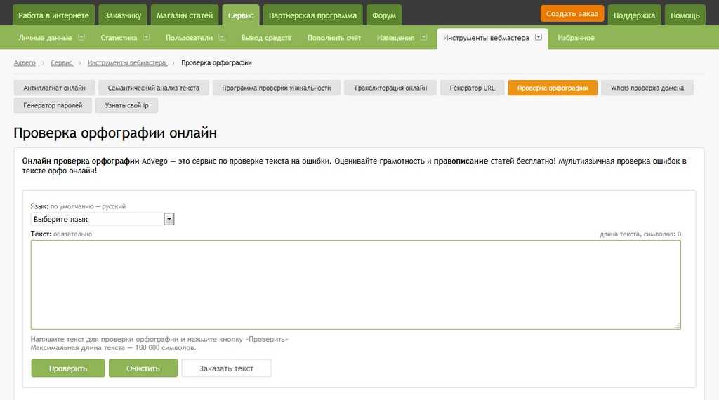 Advego — это многим копирайтерам известный сайт. На нём вы сможете довольно быстро и комфортно проверить орфографию и пунктуацию онлайн.