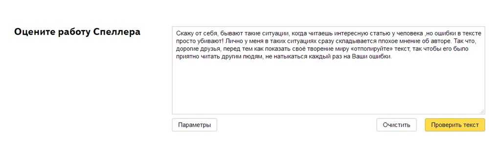 Онлайн-сервис Яндекс.Спеллер является демонстрацией возможностей API Яндекс по проверке орфографии. Разработчики могут использовать возможности данного сервиса в своих приложениях, но никто не мешает воспользоваться им и на самом сайте сервиса.