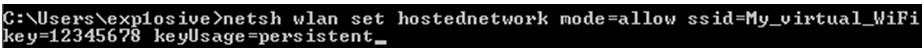 Введите запрос формата «“netsh wlan set hostednetwork mode=allow ssid=»имя сети» key=»пароль» keyUsage=persistent», где «Имя сети» и «Пароль» нужно заменить на соответствующие параметры вашей беспроводной сети.