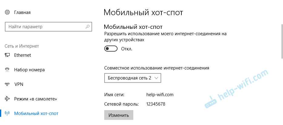 Таким образом, через «Параметры» пользователь может не только включить раздачу, но и придумать имя сети вместе с паролем к ней. На смартфоне и любом другом устройстве, способном подключаться к интернету через Wi-Fi, начнет отображаться сеть вашего ноутбука.