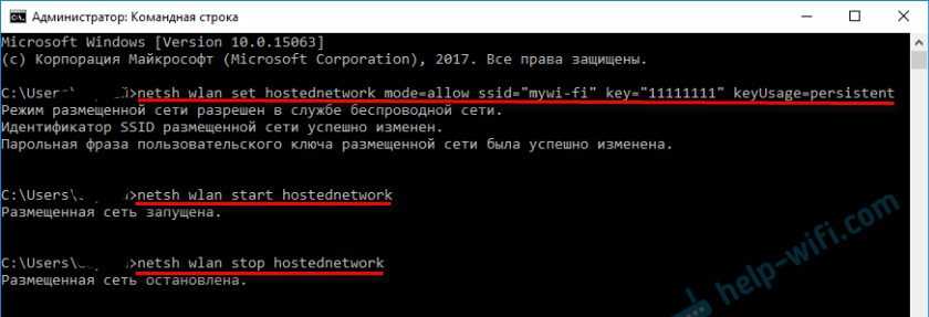 netsh wlan set hostednetwork mode=allow ssid=»mywi-fi» key=»11111111″ keyUsage=persistent – где «mywi-fi» это имя сети, а «11111111» это пароль. Их можно сменить на свои. Эту команду выполняем только один раз. Или когда нужно сменить имя сети, или пароль.