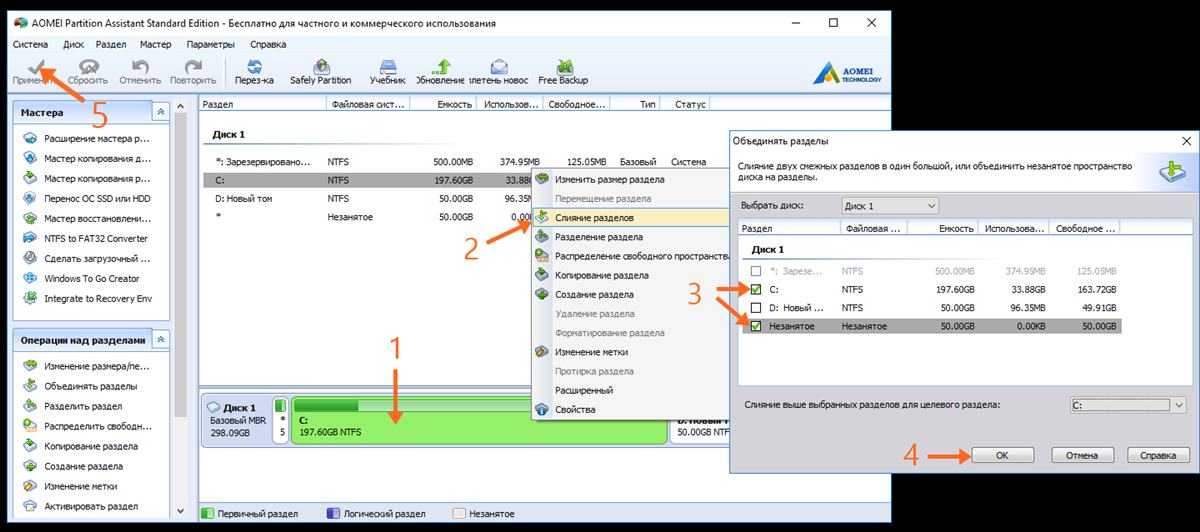 Аналогично слиянию раздела C с незанятым пространством в программе AOMEI выполняется разделение одного тома на несколько, их объединение и всевозможные другие операции