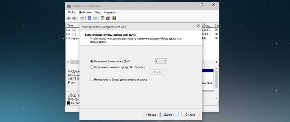 После этого у нас появляется возможность выбрать для своего раздела жёсткого диска латинскую букву, которой он будет обозначаться. у меня уже есть два диска C и D, третий я назову F. Выбираем и нажимаем «Далее».