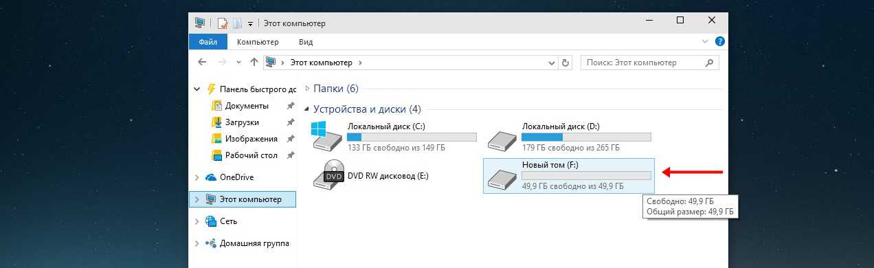 Дождавшись завершения формирования раздела, вы увидите, что новый том появился в списке. На главной странице «Проводника» также можно будет заметить новый раздел.