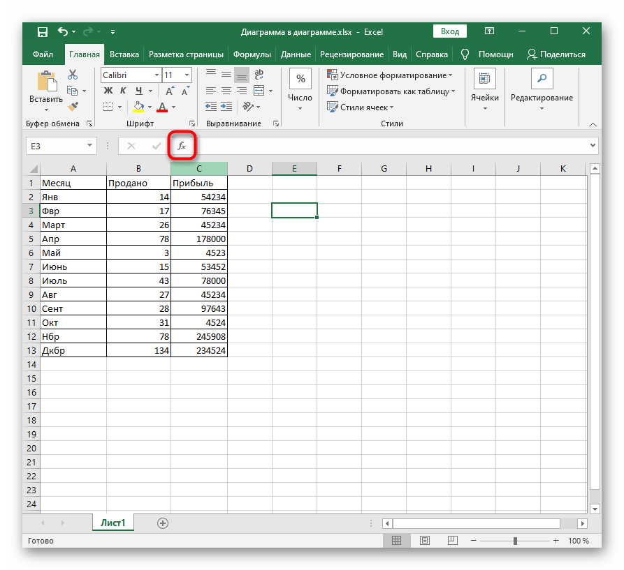 - Сделайте активной клетку с формулой. Нажмите на иконку «Fx».