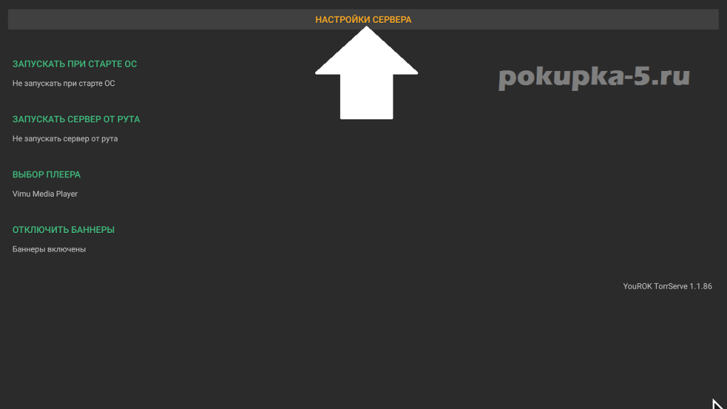 После установки сервера возвращаемся на главное меню приложения (кнопка “Назад” на пульте или в меню быстрого доступа) и нажимаем на меню Настройки.
