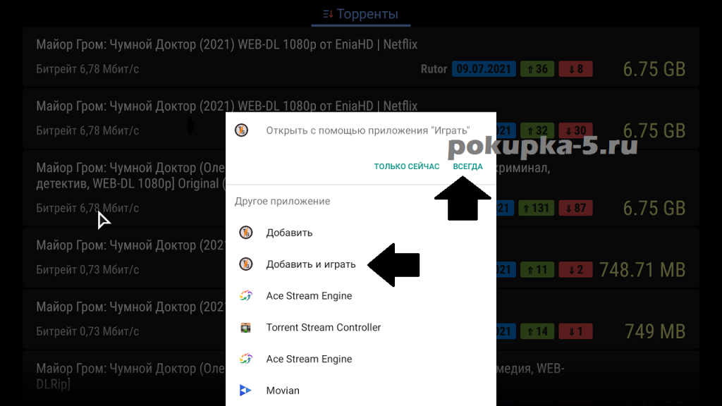 Теперь в онлайн кинотеатре при просмотре через торрент будет предложено меню выбора приложения движка. Для выбора Torrserve есть три варианта: Играть, Добавить и играть, Добавить. Рядом с ними иконка приложения в виде букв “T/S”. Выбираете “добавить и играть”.