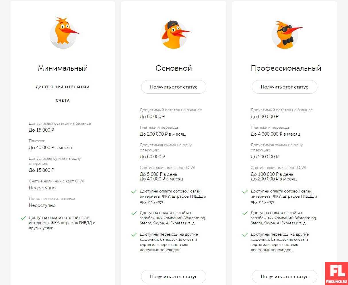 Дальше на странице предлагается два варианта расширение аккаунта, каждый из которых увеличивает лимиты. Здесь существуют определенные ограничения на сумму хранения денежных единиц, платежи и онлайн-переводы в месяц, и сколько доступно для снятия наличных. Ниже предоставлены статусы идентификации.