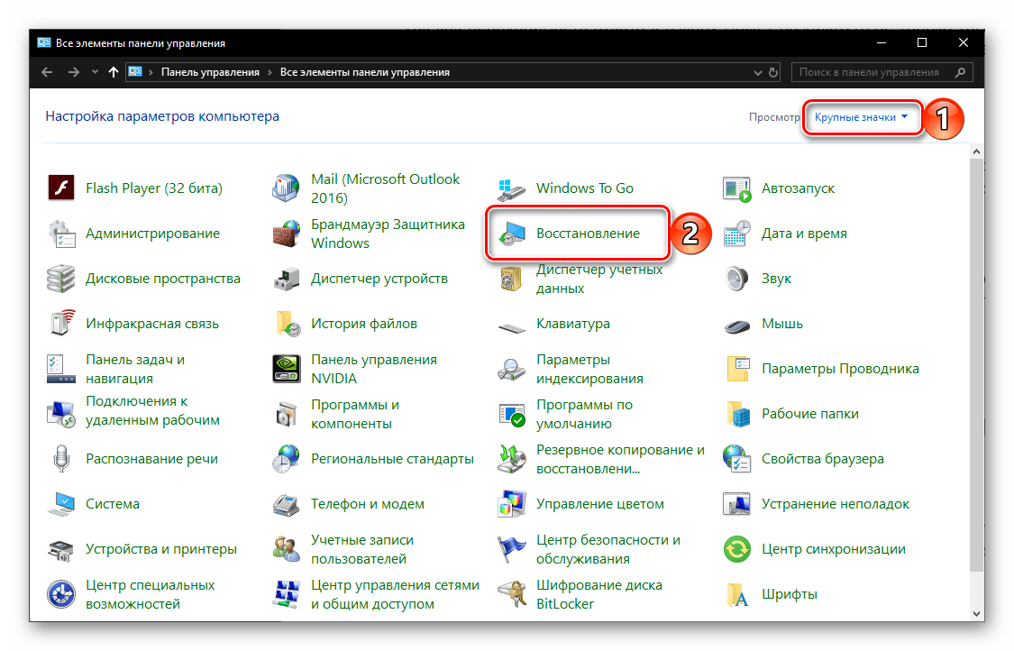 В окне «Все элементы панели управления» выбираем опцию «Восстановление».