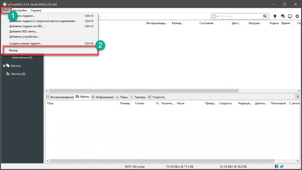 Следующий шаг — выйти из программы utorrent. В отличии от классических приложений Windows — торрент клиенты не закрываются по клику на «крестик», а продолжают в фоне закачку. Чтобы корректно закрыть программу нужно в меню выбрать пункт «Файл» и внажать «Выход» — теперь приложение точно закрылось.