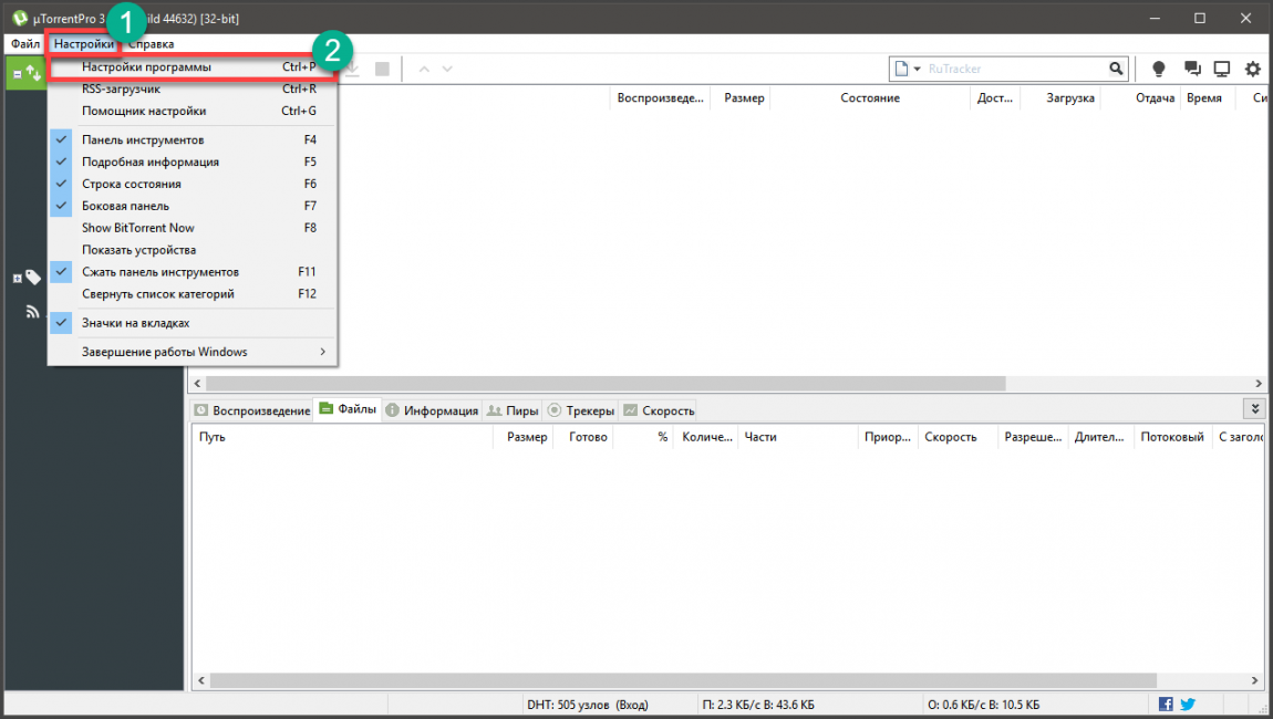 Сначала запускаем торрент-клиент и жмем по пункту Настройки . В появившемся меню выбираем Настройки программы . Или просто жмем Ctrl+P сразу после запуска программы.