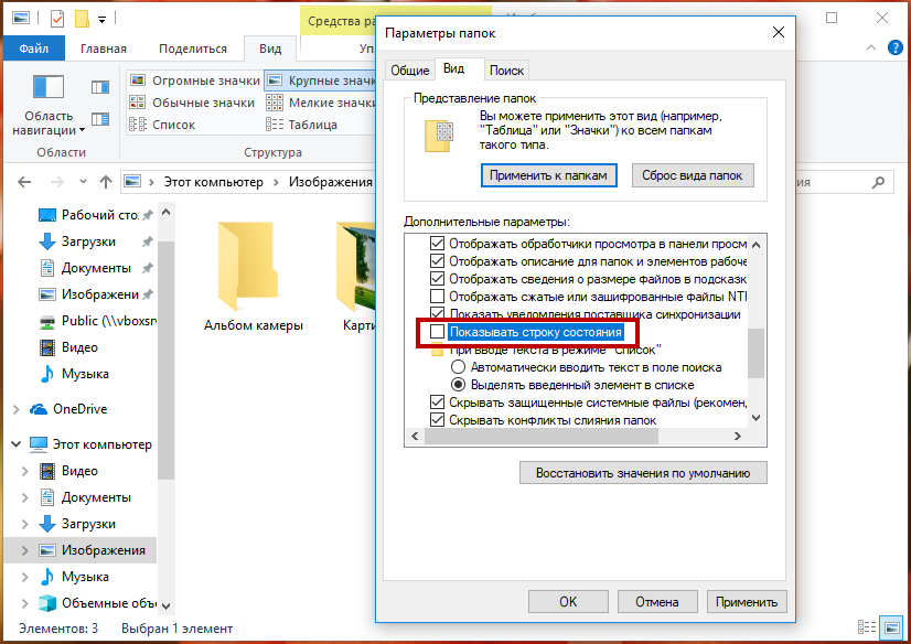 В открывшемся диалоговом окошке на вкладке «Вид» найдите пункт «Показывать строку состояния», снимите с него галочку и сохраните настройки.