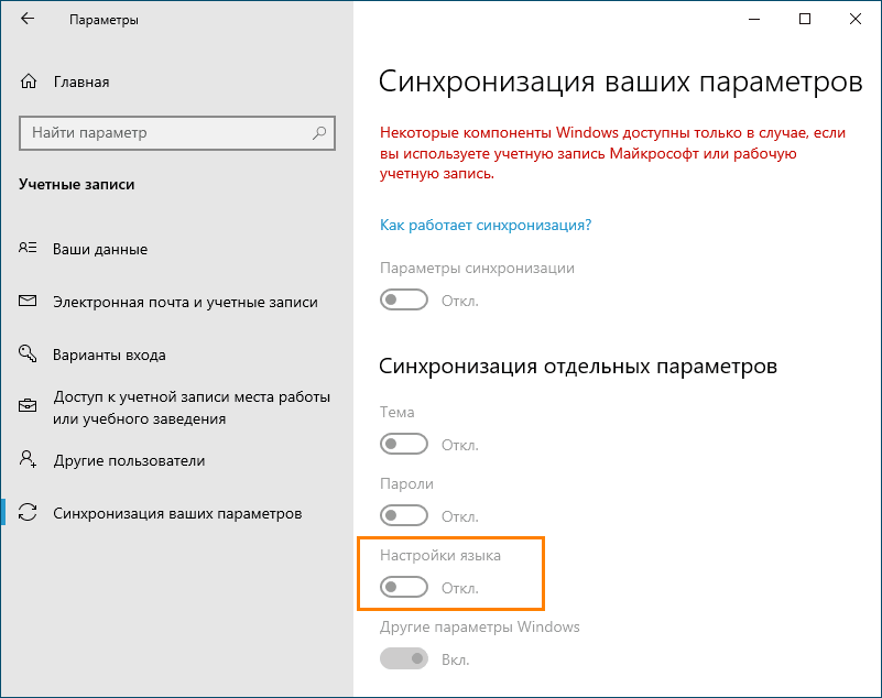 Поэтому, перед тем как приступать к дальнейшим действиям, потрудитесь отключить синхронизацию языковых настроек в разделе «Учетные записи» приложения «Параметры».
