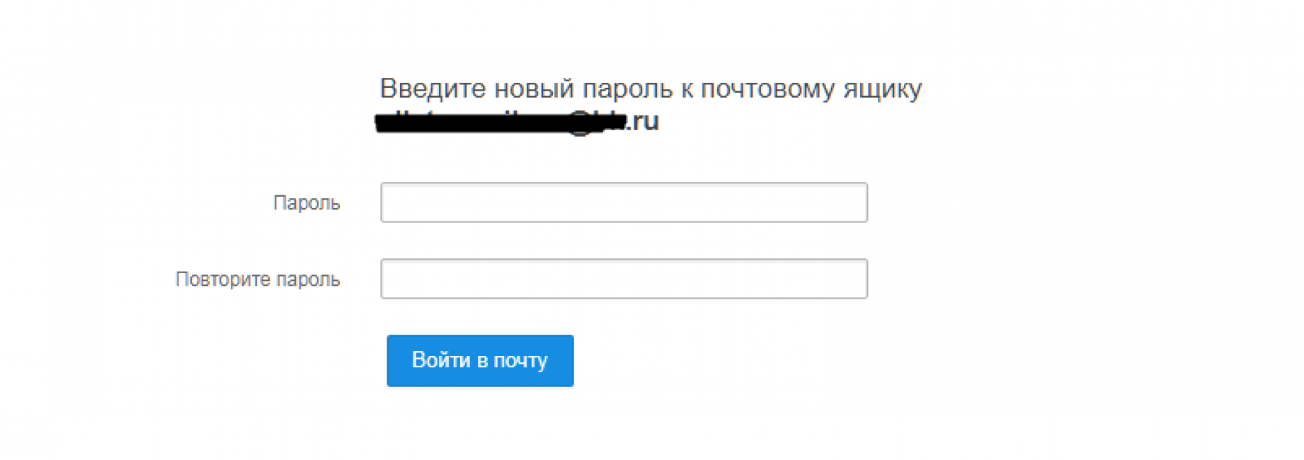 Если вся информация введена правильно, то высветится следующая форма, в которой можно будет ввести новый пароль (и, соответственно, повторить его). После этого достаточно нажать на кнопку «Войти в почту» и снова начать пользоваться своим электронным адресом (или же удалить его).