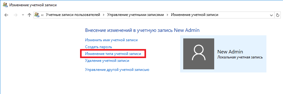 В следующем окне нам необходимо выбрать пункт «Изменение типа учетной записи». Это нужно для того, чтобы изменить тип нашей учетки с обычной на администратора.