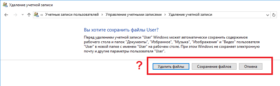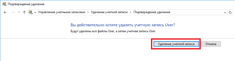 Данный способ тоже применяется в тех случаях, когда вам нужно полностью избавиться от учётной записи и данных, на ней хранящихся. Следует понимать, что в случае удаления таким способом могут пострадать файлы, хранящиеся в папках «Рабочий стол», «Документы», «Избранное», «Музыка», «Видео» и «Изображения».