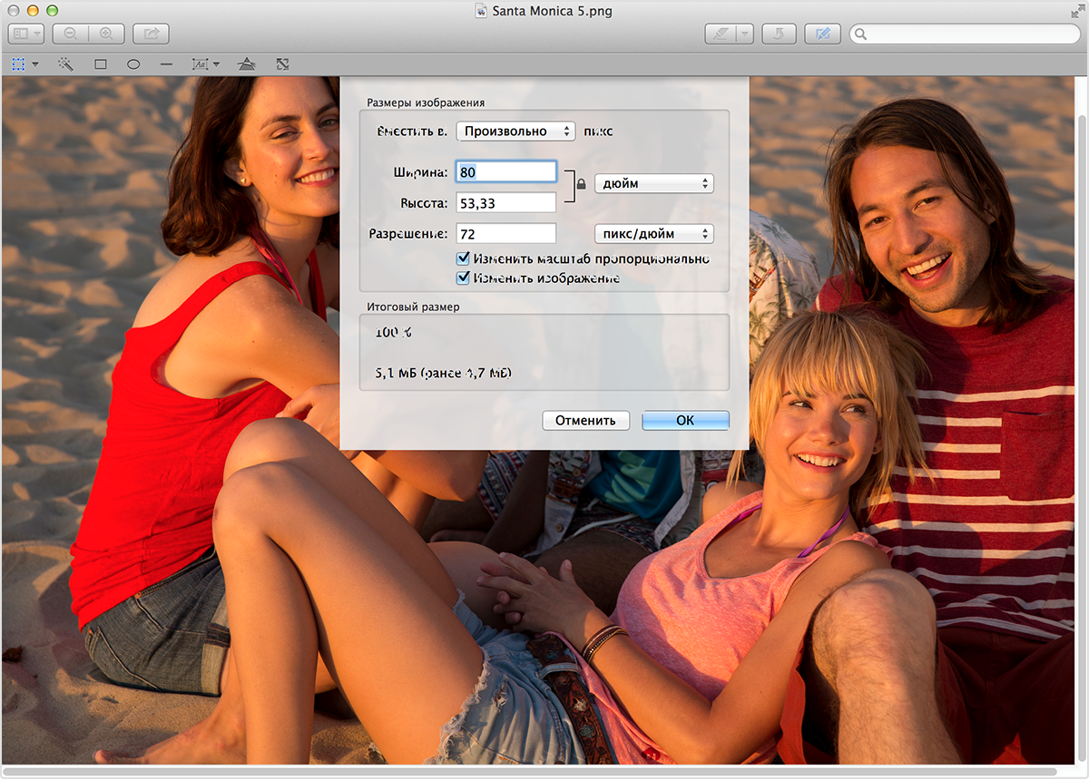 В открывшихся настройках укажите желаемые размеры в пикселях или в процентах. Если выбрать проценты, изображение будет уменьшаться с сохранением пропорций. Для удобства имеется список стандартных разрешений. После выбора нажмите «ОК», чтобы сохранить изменения.