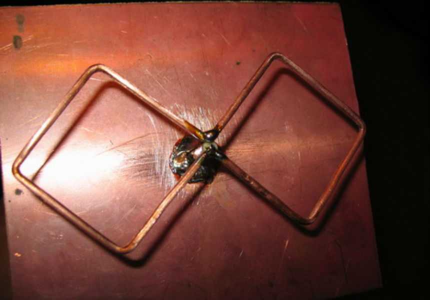 - Антенна Харченко. Представляет собой резонатор в виде двух ромбов, установленный над рефлектором. Геометрические размеры зависят от полосы частот, в которой планируется усиливать радиосигнал. При изготовлении есть жесткое условие – сохранение точности вплоть до десятых долей миллиметра. Соединение с приемником осуществляется через коаксиальный кабель и переходники.