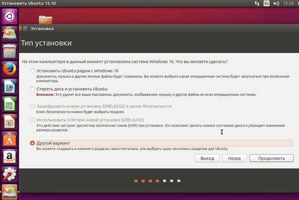 Зависимо от того, имеете ли вы опыт установки других операционных систем или нет, утилита предлагает два варианта, как установить ОС и разметить файловую систему: автоматическая и ручная. В первом случае вам нужно установить курсор напротив пункта, предлагающего стереть всё содержимое диска и выполнить установку Linux. Устанавливая всё вручную, отметьте пункт «Другие варианты» либо же «Ручная установка».
