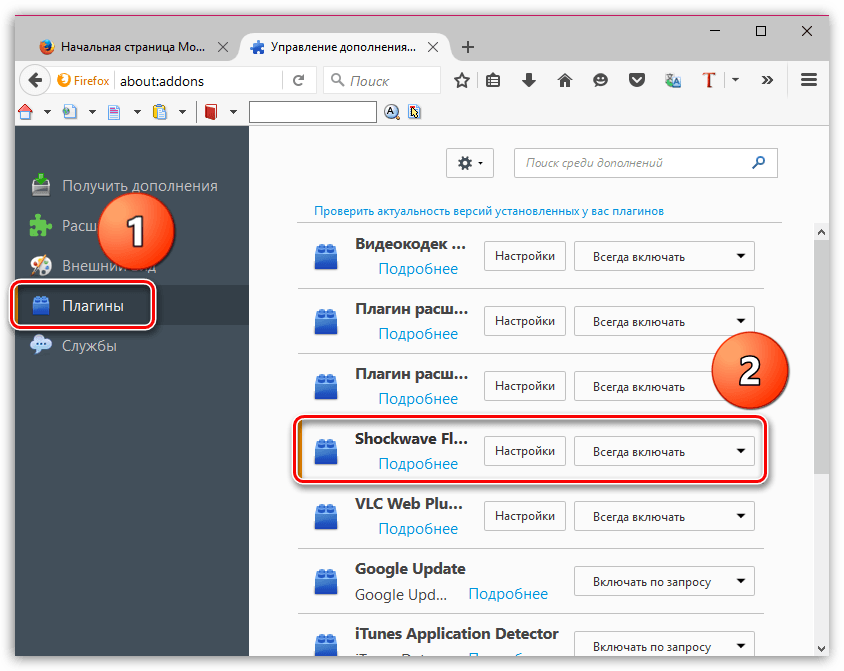 После этого необходимо выбрать раздел «Плагины». Как только откроется новое окно, требуется найти приложение «Shockwave Flash». Теперь рекомендуется установить значение «Всегда включать».