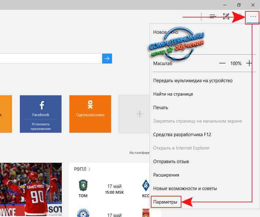 И так чтобы очистить историю в microsoft edge, вам нужно будет выполнить следующие действия в своем браузере. Наводим курсор мыши на кнопку настроек «с тремя точками» и один раз нажимаем левую кнопку мыши, после чего раскроется дополнительное меню, в котором, вам нужно будет выбрать пункт «Параметры».