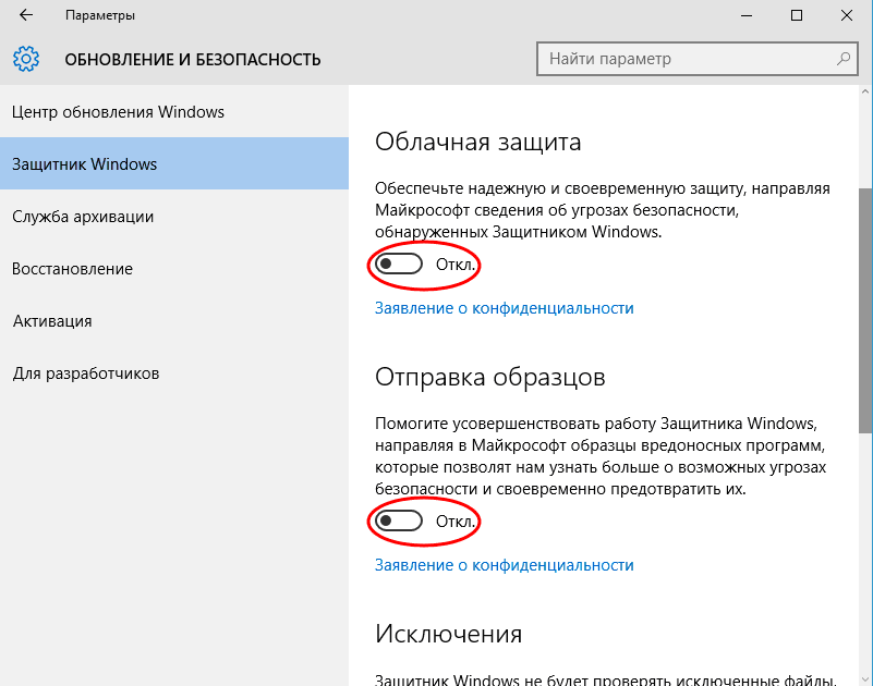 Здесь можно выключить функцию «Облачной защиты», а так же «Отправку обнаруженного вредоносного ПО для изучения». Кроме того, есть возможность добавлять в исключения файлы, которые не будут проходить проверку через Защитник.
