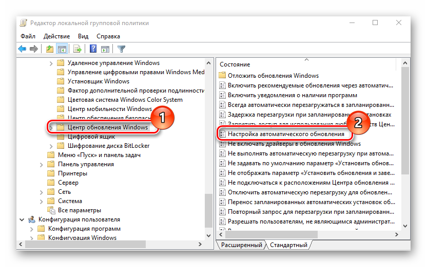 Находясь в редакторе GPedit, войдите в раздел «Конфигурация компьютера», затем в «Административные шаблоны» и «Центр обновления Windows». В левой стороне окна найдите «Настройку автоматического обновления». По умолчанию его политика не задана.