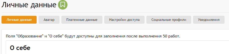 Рассказать о своих профессиональных навыках, образовании не получится. Отредактировать эти поля можно только после 50 выполненных заказов.
