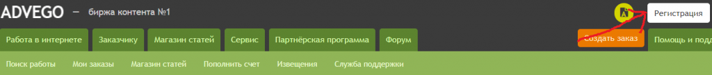 Открываем главную страницу официального сайта Advego. Вам нужно нажать “Регистрация” в верхнем углу.