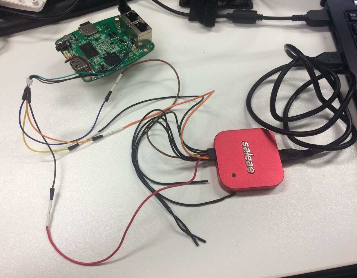 Как насчет UART? Тут предстоит определить, за что отвечает каждый пин и какова скорость передачи данных. Для этого воспользуемся логическим анализатором Saleae Logic. Для удобства я подключился через проводок, который соединяет плату устройства и инфракрасные лампочки.