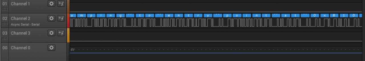 После включения устройства на пине номер 3 (в программе отсчет идет с нуля и пин нумерован как 2) передаются бинарные данные. Этот пин интерфейса UART отвечает за передачу данных (TX). Просмотрев длину одного бита, получаем текущую скорость передачи — 115 200 бит в секунду. При корректных настройках мы даже можем разглядеть часть текста.